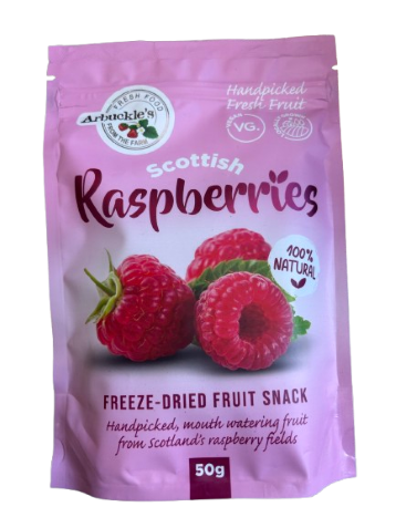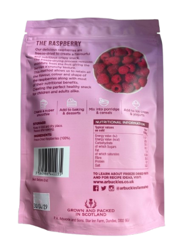 Arbuckle’s delicious raspberries are freeze-dried to create a flavourful and nutritious crispy snack. The freeze-drying process removes moisture from the fruit iving the berries a crunchy texture. This method allows Arbuckle’s to retain all the flavour, colour and shape of the raspberries along with most of their nutritional benefits. Creating the perfect healthy snack for children and adults alike. Grown and packed in Scotland.