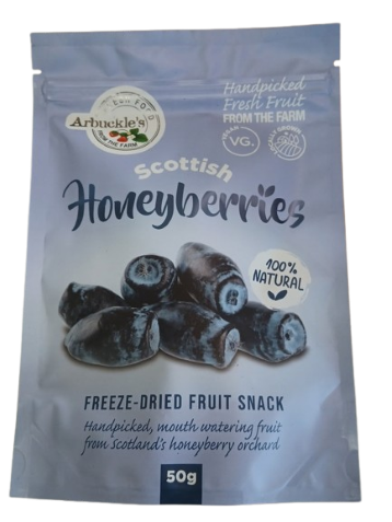 Arbuckle’s delicious honeyberries are freeze-dried to create a flavourful and nutritious crispy snack. The freeze-drying process removes moisture from the fruit giving the berries a crunchy texture. This method allows Arbuckle’s to retain all the flavour, colour and shape of the honeyberries along with most of their nutritional benefits. Creating the perfect healthy snack for children and adults alike. Grown and packaged in Scotland.